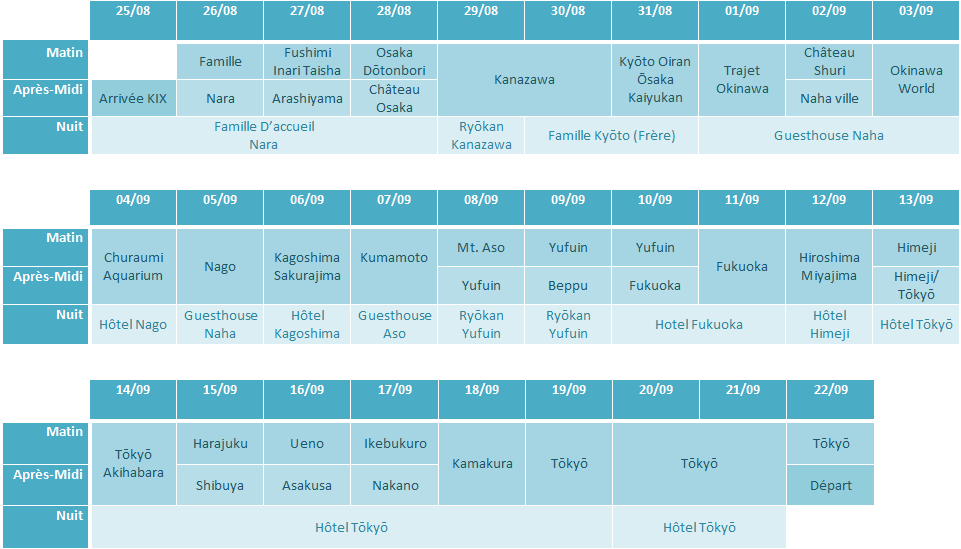 Avec un peu plus d’investissement, beaucoup de réflexion, des abandons de destinations, et un planning finalement réglé comme du papier à musique… Voilà ce que nous avions prévu :